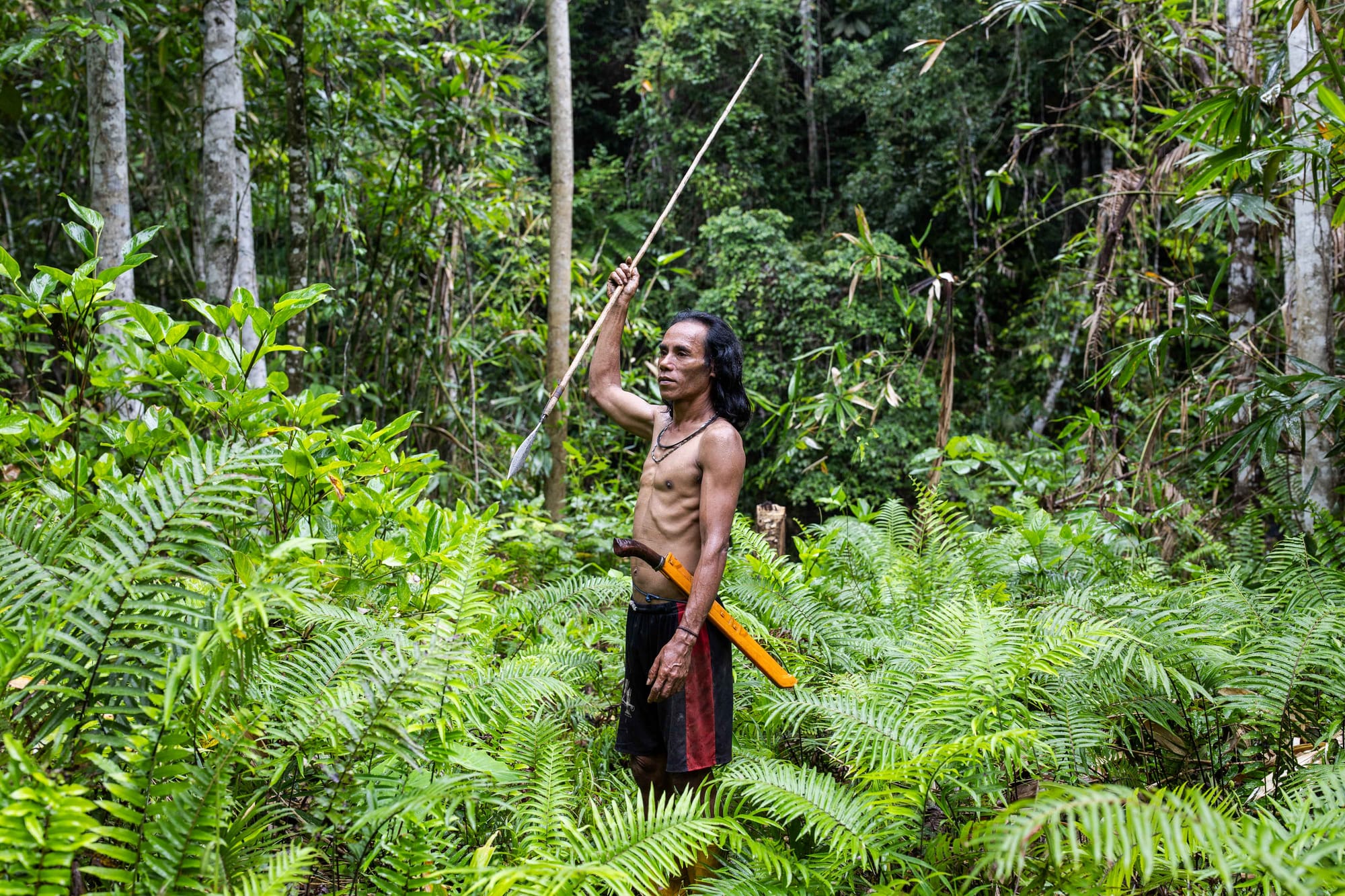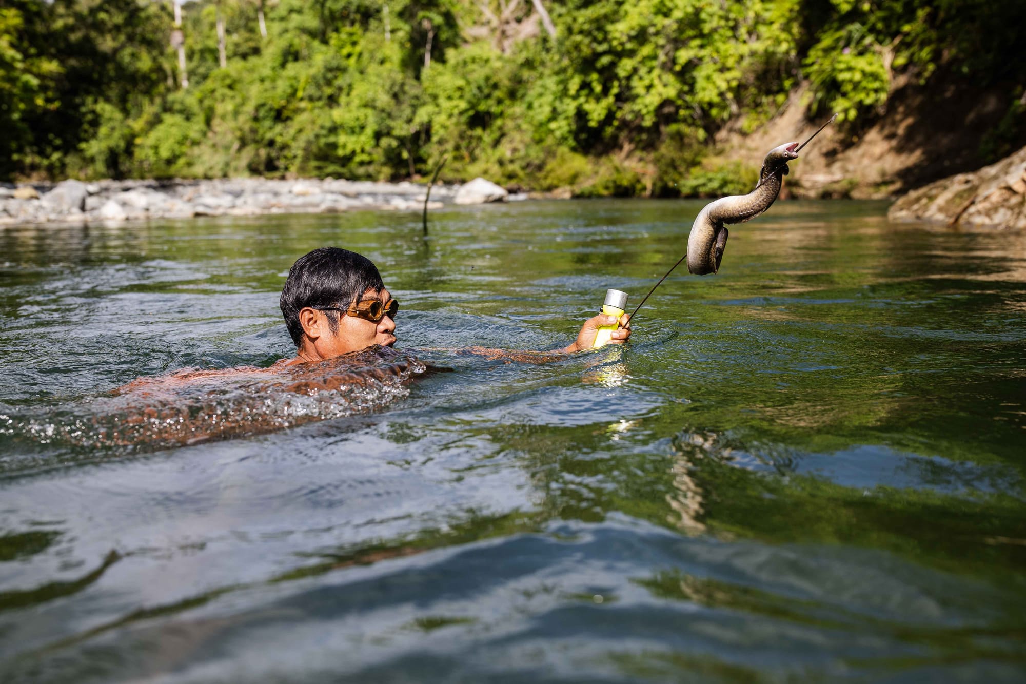 Left: Daniel Totabo catches an eel in the Halmahera rainforest, North Maluku, Indonesia. Right: Sumean Gebe posing after hunting.
