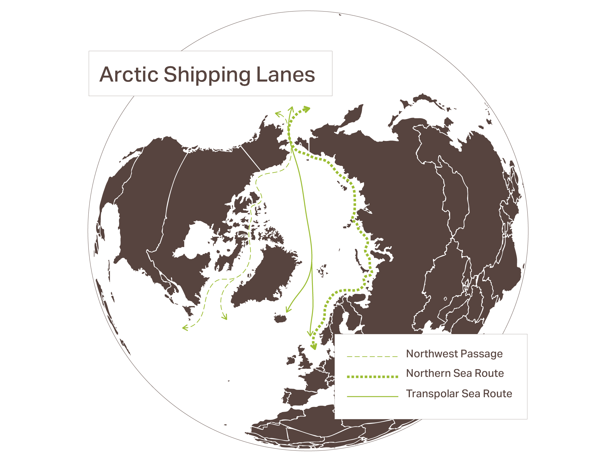 Arctic shipping lanes promise to reduce this journey by around a third. At present, there are three routes in discussion. The first and perhaps best known is the fabled Northwest Passage, connecting the Pacific Ocean to the Atlantic through a series of narrow inlets among the shallow waters of North America. This is the route that European colonizers spent 300 years searching for, shipwreck after shipwreck, in their efforts to establish a lane between America and Asia.[2] For much of the year it is rocky, shallow and bound up with sea ice, making navigation extremely difficult, and virtually uninsurable.