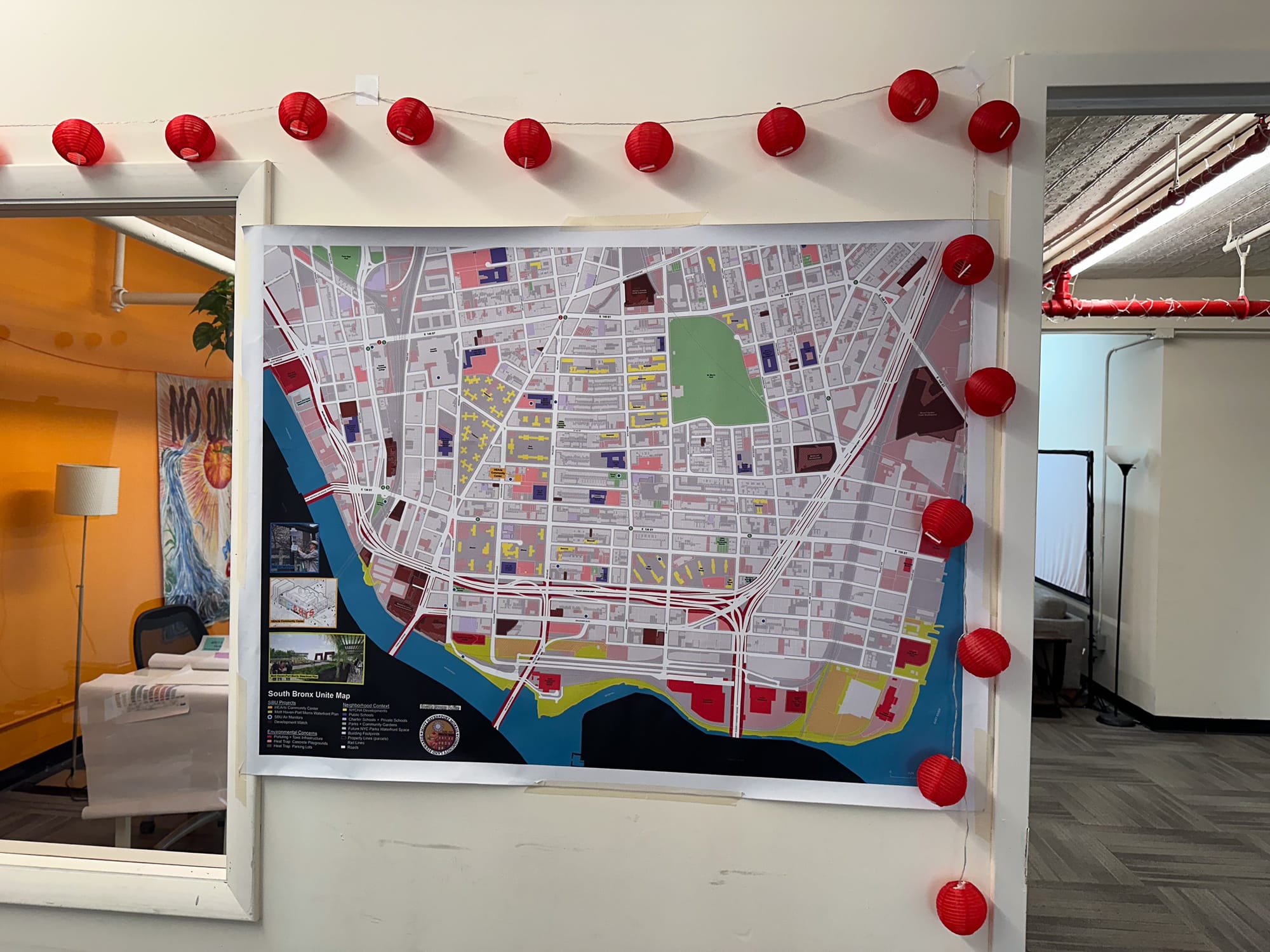 He leads me into the conference room, where we sit at a large table in front of a detailed map of the area under the organization’s purview. The South Bronx peninsula is coloured to demarcate zones with significant environmental concerns—places with high levels of pollution, toxic infrastructure and heat traps. The map also features signs of SBU’s work: blue dots represent the 50 air monitors they have installed, while an orange box represents the location of a vacant detox centre that will soon be transformed into the Health, Education and Arts (H.E.Arts) Center.