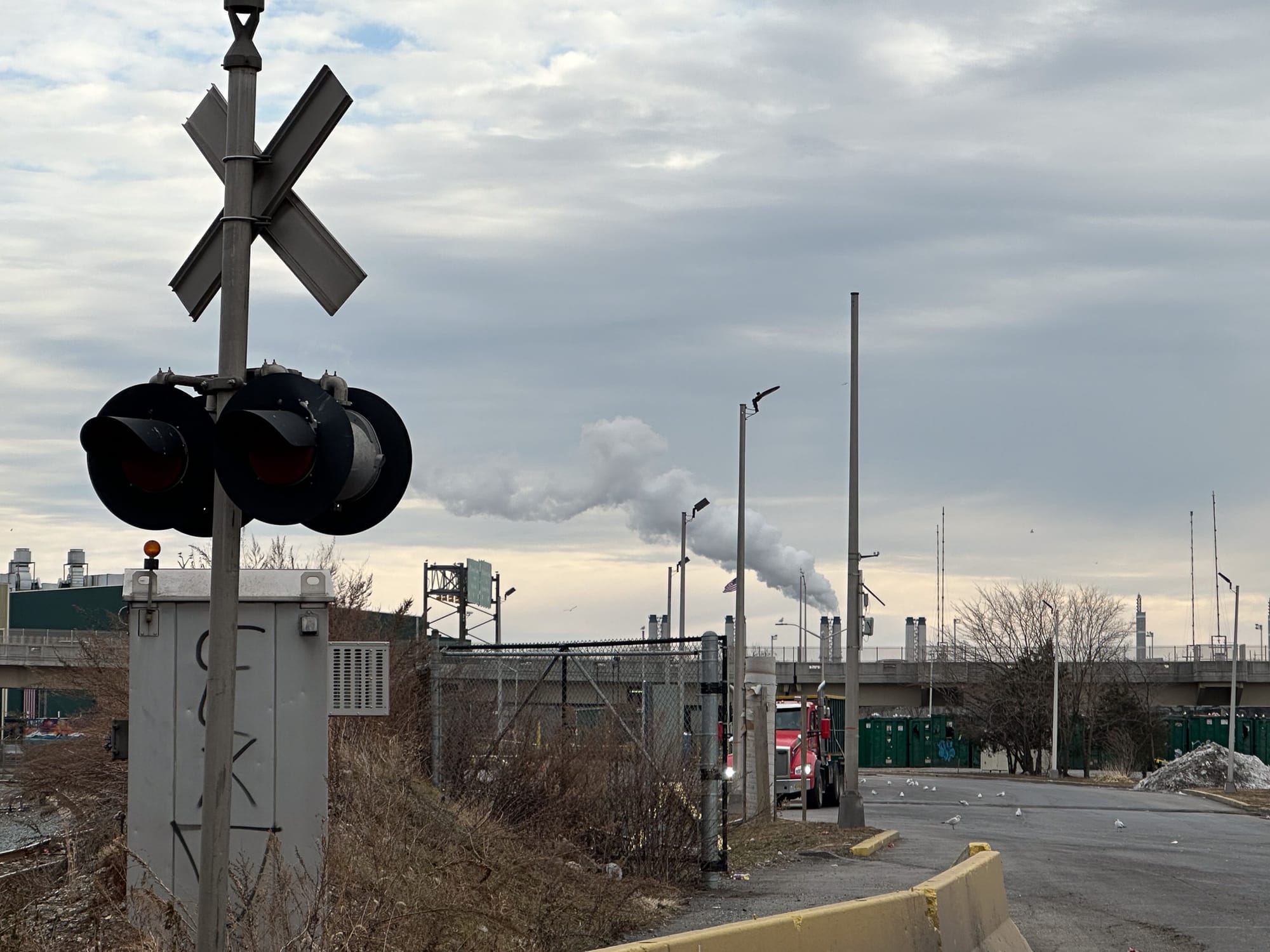 It’s bitterly cold as Mychal and I walk across the tracks of the Oak Point Link, the freight train that shuttles rubbish to Virginia, and towards the gates of the Harlem River Yard. Across the river, the high-rises of East Harlem in Manhattan jut out, wrapped in the trimming of the Harlem River Drive, another remnant of Robert Moses’s influence on the city. Further out, the smokestack of the Astoria Generating Station in Queens belches plumes of toxic air upwind toward the Bronx. As we gaze out on industrial New York we’re interrupted by a diesel truck from Waste Connections, here to dump his latest collection at the Harlem River Transfer Station.